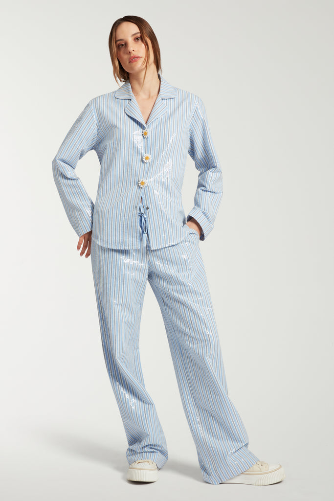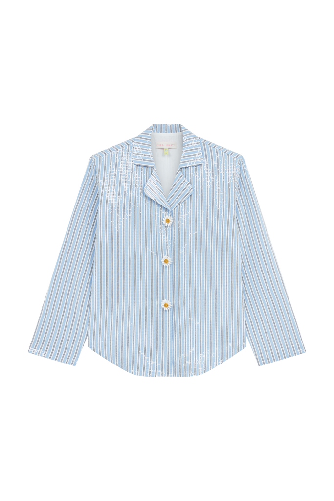 Sequinned Striped Shirt With Daisy Brooches